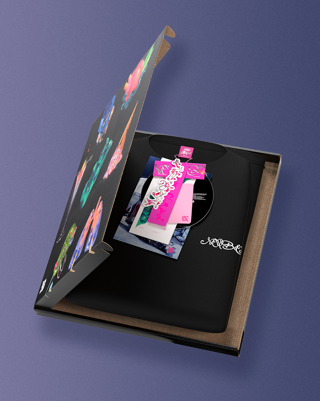 The package was centered around t-shirts featuring member-specific symbolic illustrations, with each component expressed through tag-shaped graphic elements to visually reinforce the concept and direction of the merchandise.