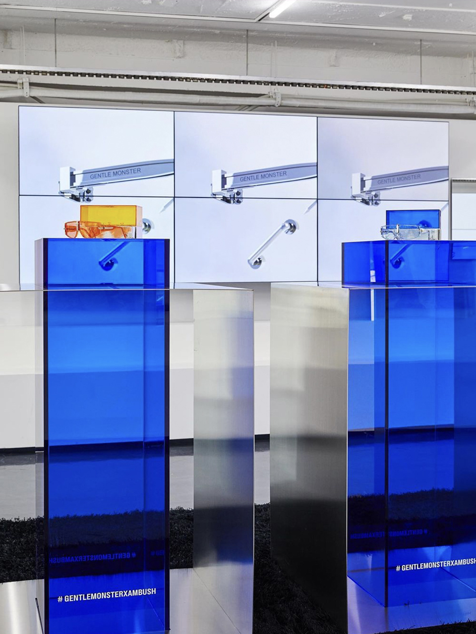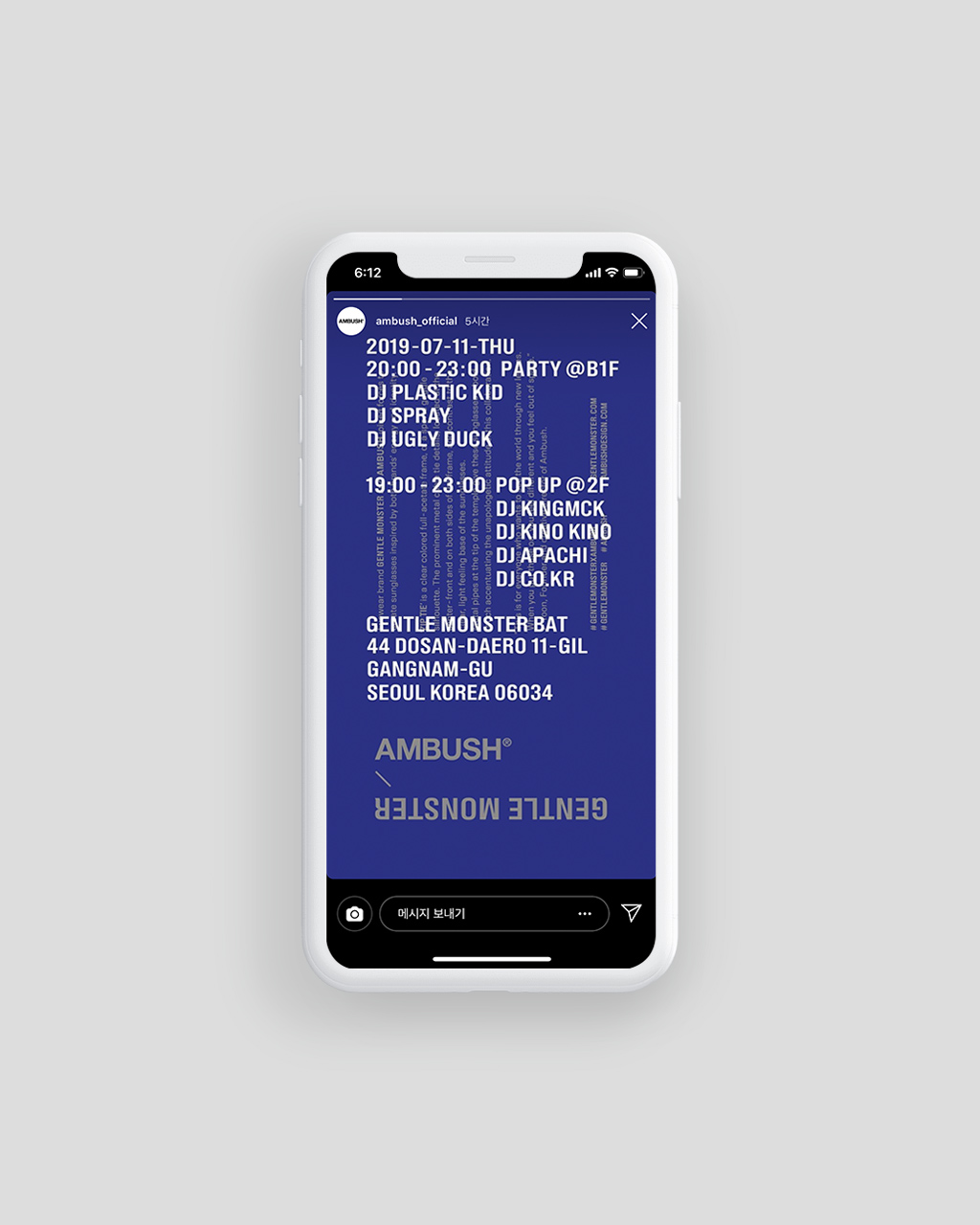 ジェントルモンスターとアンブッシュの初のコラボレーションにおいて、パッケージ、グラフィックアイデンティティ、ポップアップイベントスペースのグラフィックデザインを手がけました。アンブッシュ東京旗艦店のサインからインスピレーションを受け、縦型のコラボレーションロゴをデザインし、このロゴを活用したサングラスアクセサリーもデザインしました。ショーケースに展示されたサングラスの姿をパッケージデザインに反映させることを目指し、完成したパッケージは空間のデコレーション要素としても活用されました。ポップアップイベントは東京とソウルで開催され、イベントスペースのグラフィックや招待状、プレスキット、サインなどもデザインしました。
