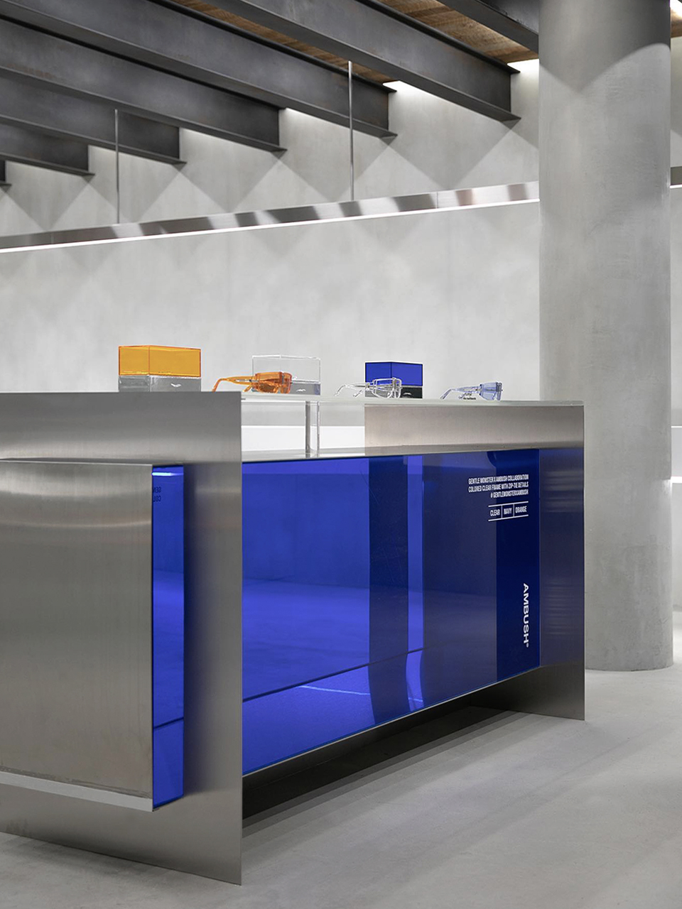 앰부시 도쿄 플래그쉽 스토어의 사이니지에서 영감을 받아 콜라보레이션 로고를 세로형으로 디자인했으며, 콜라보레이션 로고를 응용한 선글라스 악세서리를 디자인 했습니다.